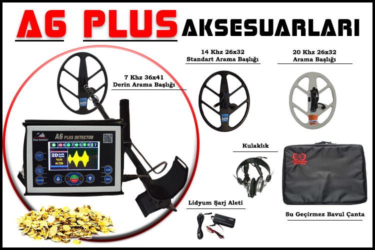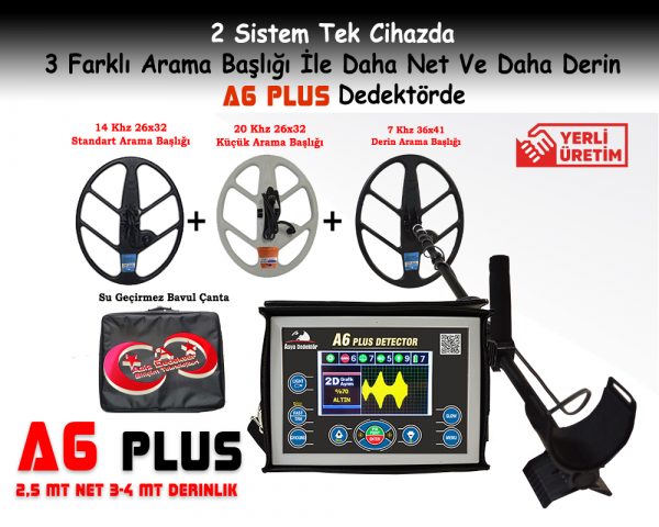 A6 Plus Dedektör, A6 Plus altın ve define aramalarında en derin altın bulucu define dedektörlerinden biridir. A6 Plus fiyatı, özellikleri, derinlik hesaplaması ve daha birçok özellikleri olan tam donanımlı altın arama dedektörüdür. A6 Plus toprak ve kaya içerisindeki altın paraları ve toprak içine ya da kaya içine yapılmış olan oda mezarları, tünelleri, mahzenlerin tespitlerini 2.5 metreye kadar net 4 metreye kadar da maksimum derinliklerden tespit yapabilme özelliklerine sahiptir.