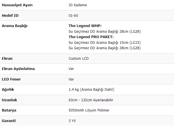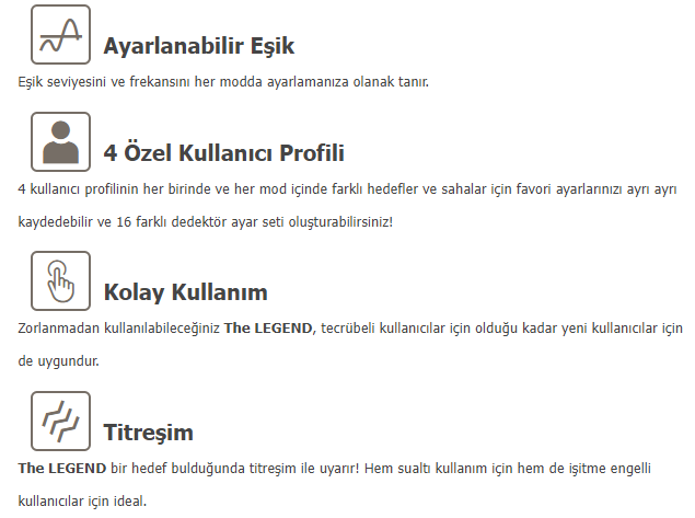 The LEGEND ayrıca, yüksek mineralli altın sahalarında küçük altın arayan kullanıcılar için de uygun teknik özelliklere de sahiptir.